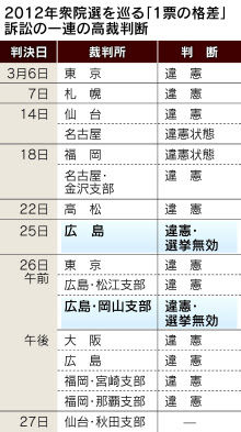 『衆院選“一票の格差”訴訟 広島高裁岡山支部「合憲」判断』毎回よくやるなぁ 『衆院選“一票の格差”訴訟 広島高裁岡山支部「合憲」判断』毎回よくやるなぁ <関連する記事> 衆院選“一票の格差”訴訟 広島高裁岡山支部「合憲」判断 去年10月の衆議院選挙の「一票の格差」をめぐる裁判で、広島高裁岡山支部は選挙は「合憲」との判断を示しました。 この裁判は、選挙区によって一票の価値に最大で2倍近い差があるため、去年10月の衆院選は無… (出典:岡山(KSB瀬戸内海放送)) <関連する画像> (出典 userdisk.webry.biglobe.ne.jp) (出典 www.nikkei.com) <関連する動画> 参院選“違憲状態” 一票の格差是正は調整難航(15/05/21) (出典 Youtube) どこからお金が出ているんでしょうね。 ツイート シェア はてブ Google+ Pocket feedly Line コメントを残す 返信をキャンセルする。 名前 (required) Mail (will not be published) (required) サイト Δ 『岡山映画ロケ 雨天延期なら補償金 4月から県「晴れの国」PR』1日15万 『自販機に紙幣大の紙入れ現金詐取 故障装う、容疑で岡山・倉敷署が男逮捕』しょぼい